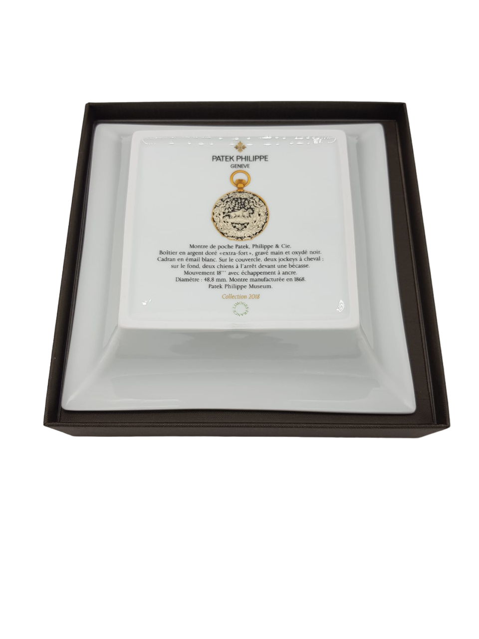 Bandeja de porcelana Patek Philippe fabricada en Limoges, esta pieza ultra coleccionable y rara solo la ofrece Patek Philippe a sus mejores coleccionistas. Cada bandeja refleja un reloj histórico, en este caso para el de bolsillo de 1868, la bandeja formaba parte de la colección 2018. Como nueva con su caja original.