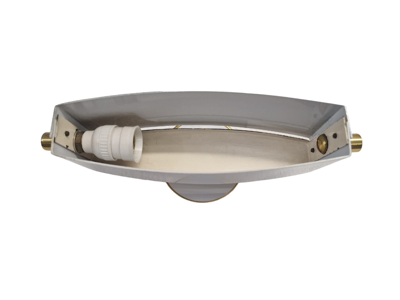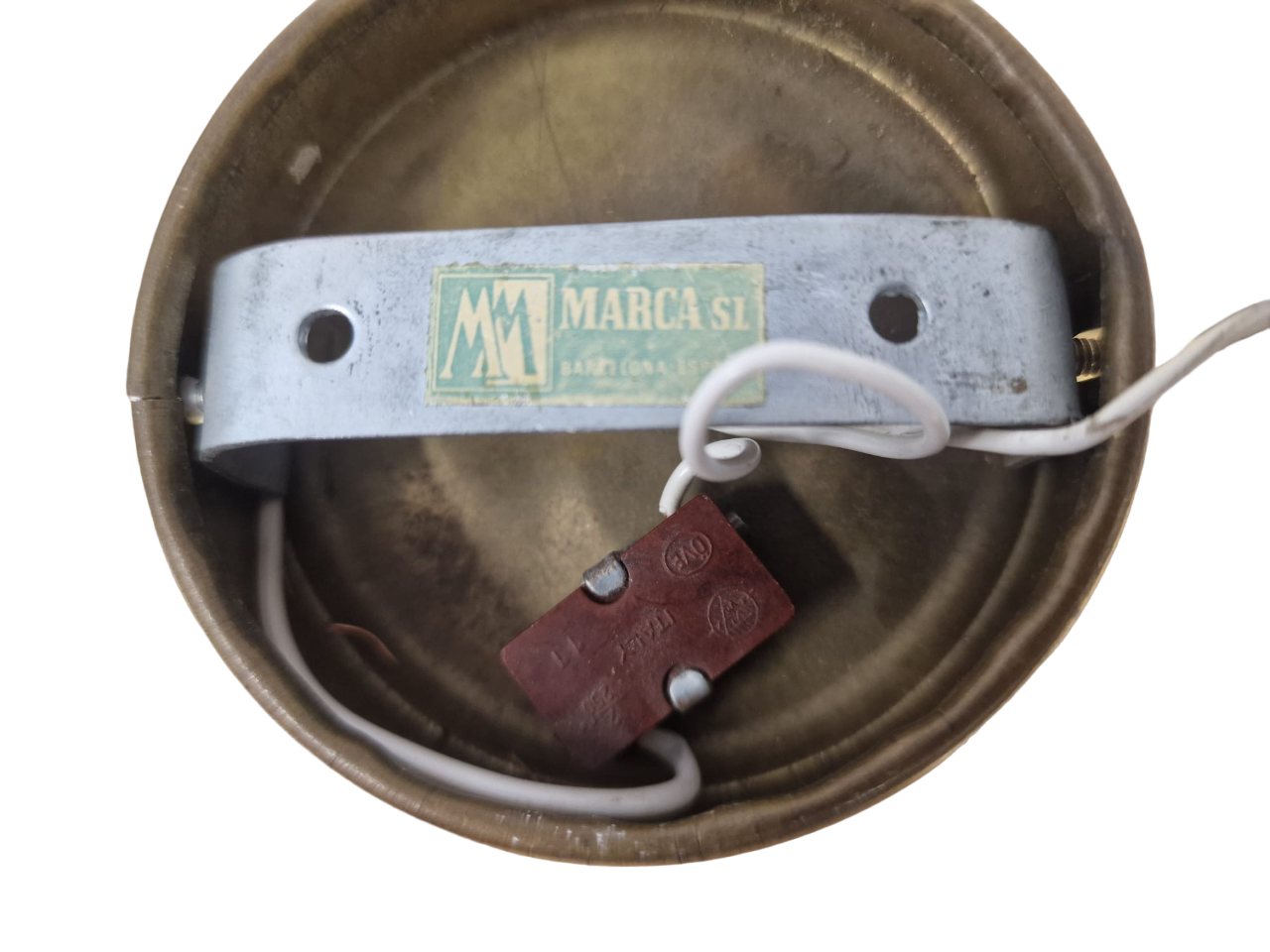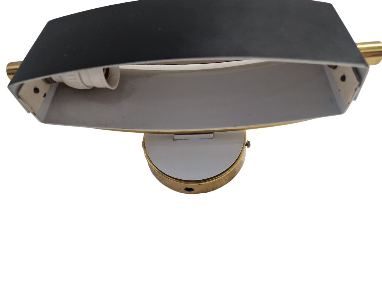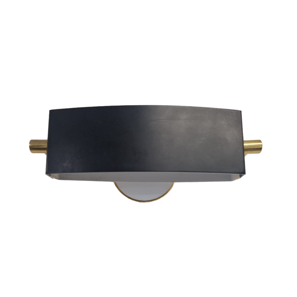 Aplique de los años 50 del prestigioso diseñador francés Jacques Biny para el fabricante Lita.Fabricado en latón con pantalla esmaltada en blanco y negro. Interruptor e instalación original. Presenta pegatina del distribuidor/vendedor en España Marca SL de Barcelona. Marcas de uso tipicas de los años.