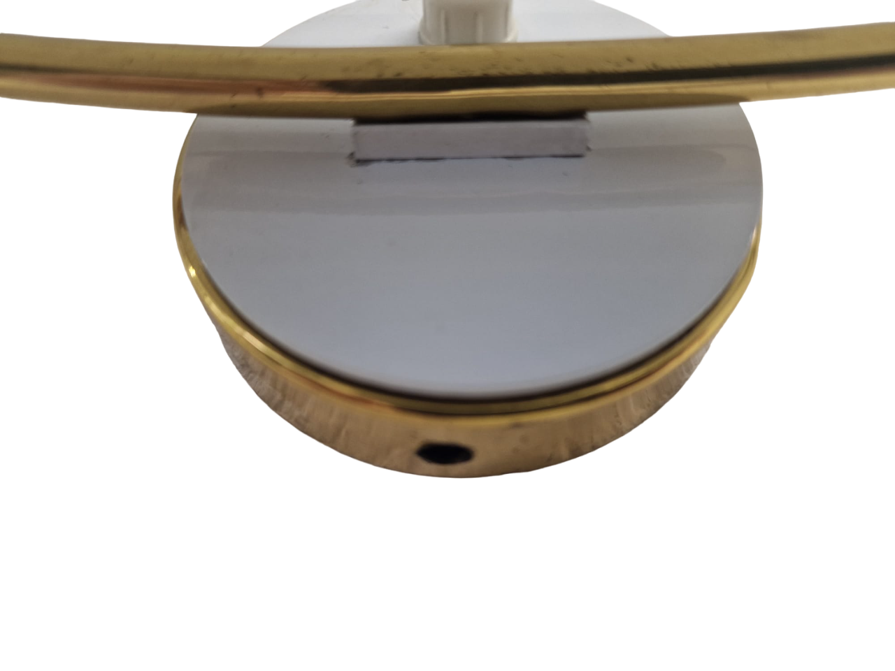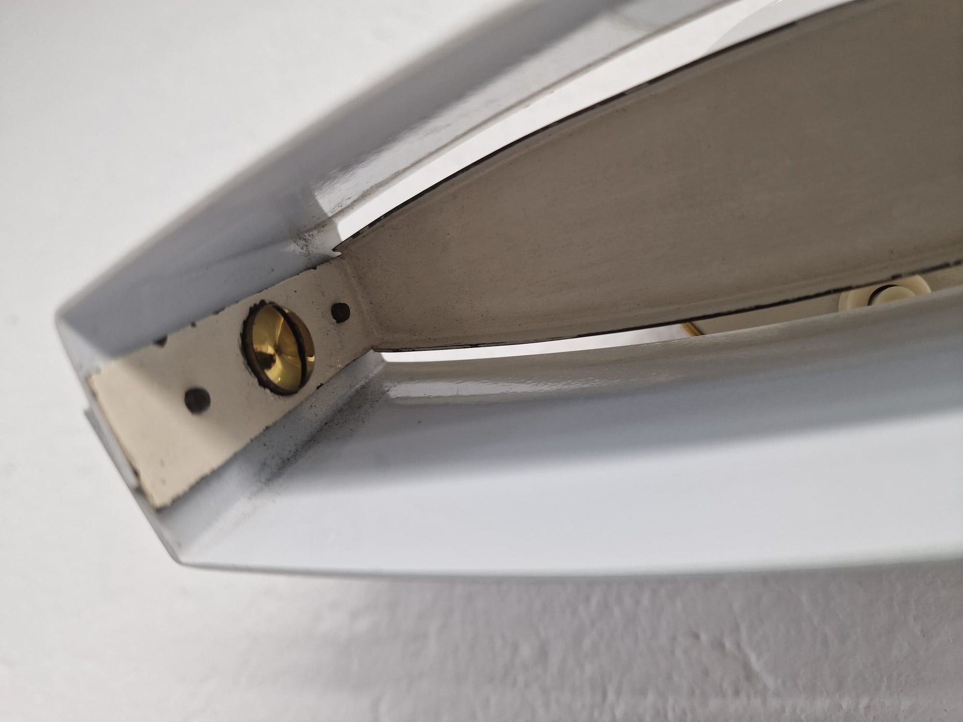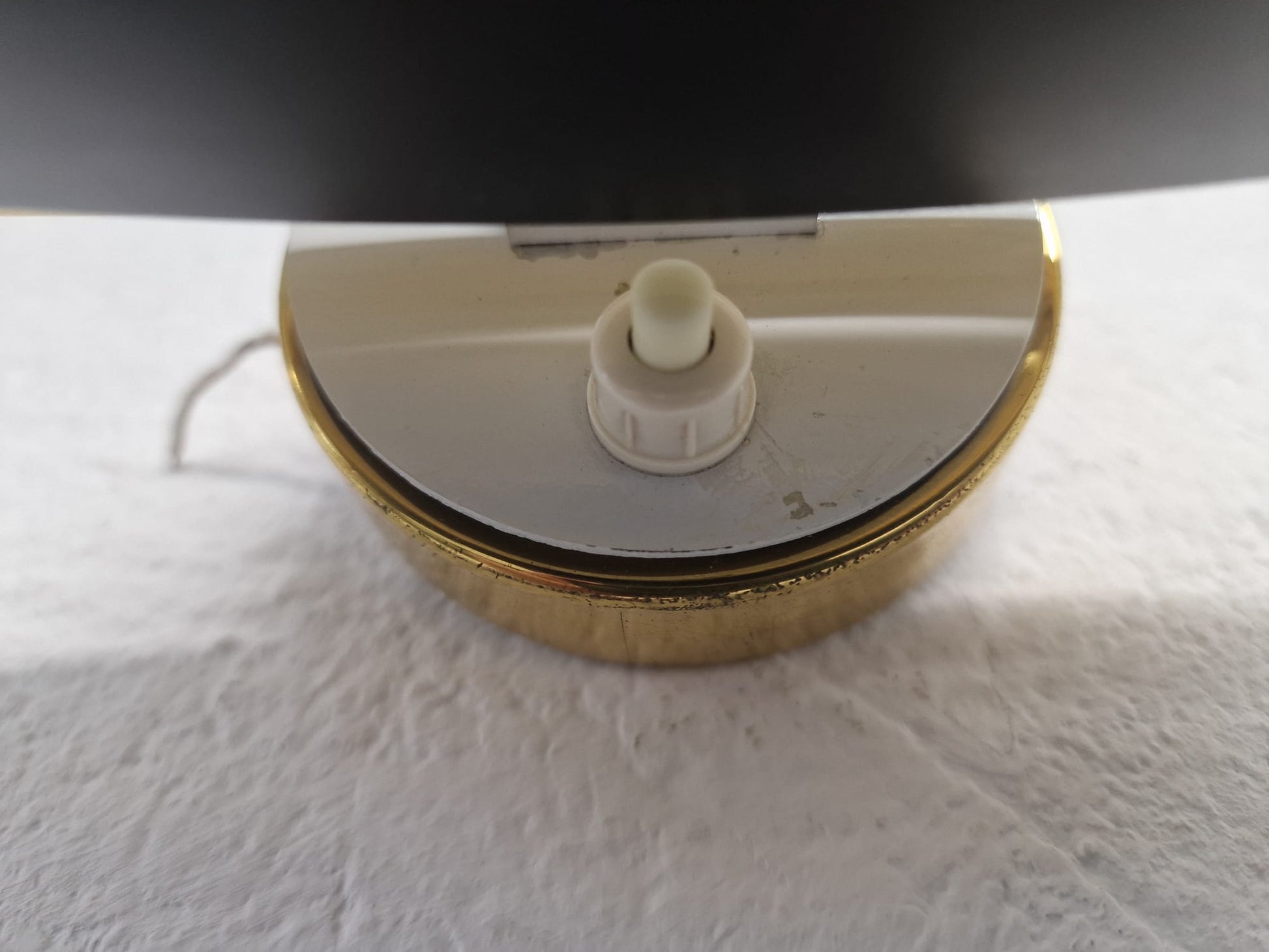 Aplique de los años 50 del prestigioso diseñador francés Jacques Biny para el fabricante Lita.Fabricado en latón con pantalla esmaltada en blanco y negro. Interruptor e instalación original. Presenta pegatina del distribuidor/vendedor en España Marca SL de Barcelona. Marcas de uso tipicas de los años.