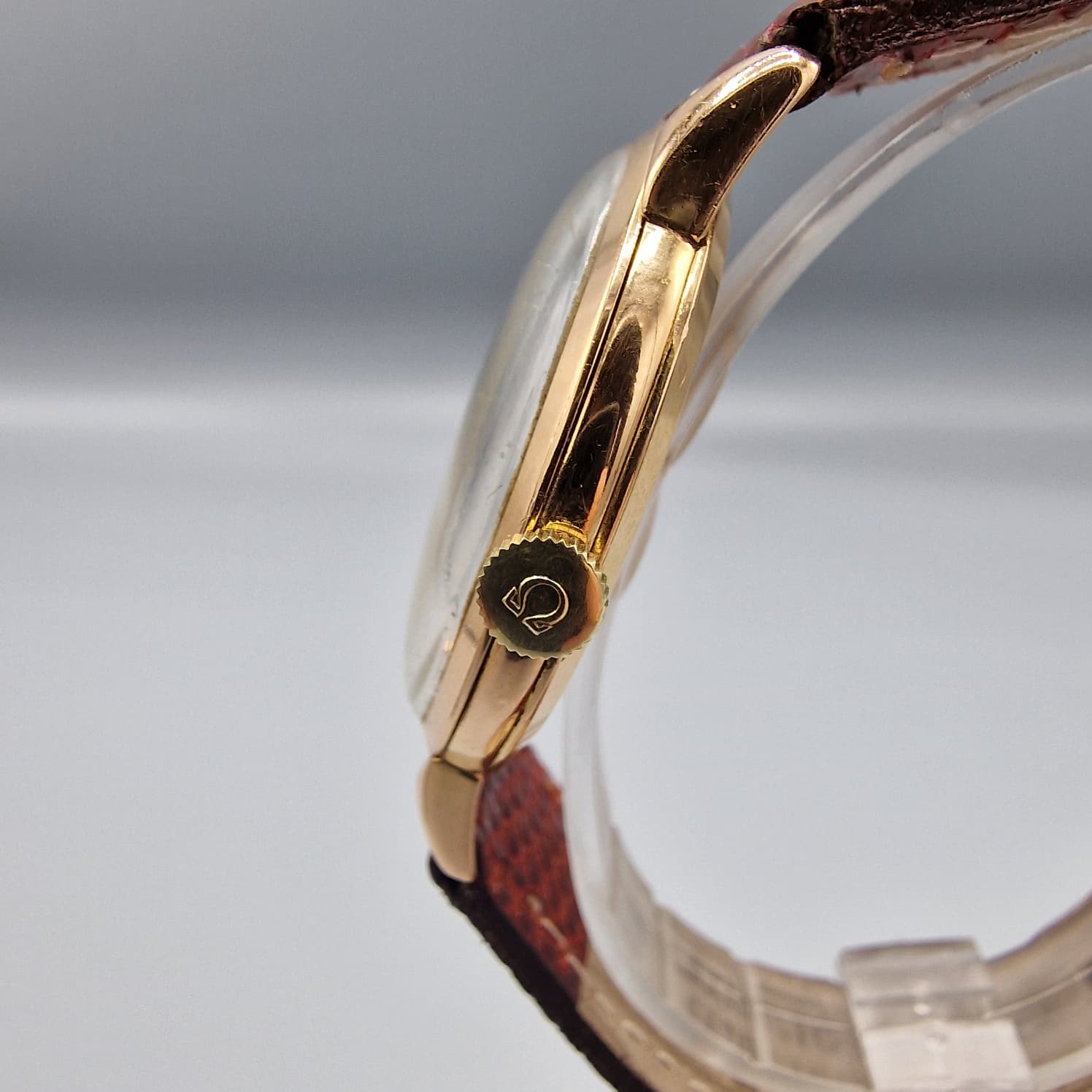 OMEGA Referencia: 2687. Año: 1954 Aprox. Movimiento: Mecánico de cuerda. Calibre Omega 266. Esfera: Dorada con agujas, números árabes e índices dorados. Lleva segundero pequeño en las "6" y anagrama Omega en las "12". Caja: Original de oro rosa 18 kts . Lleva logo Omega, contraste de oro, número de referencia y número de serie 11333580 en el interior de la tapa trasera. Corona: original con logotipo Omega. Dimensiones: 37 mm. de diámetro. Tamaño Jumbo Correa: No original en piel de lagarto legítimo. Anchura en las asas: 18 mm.