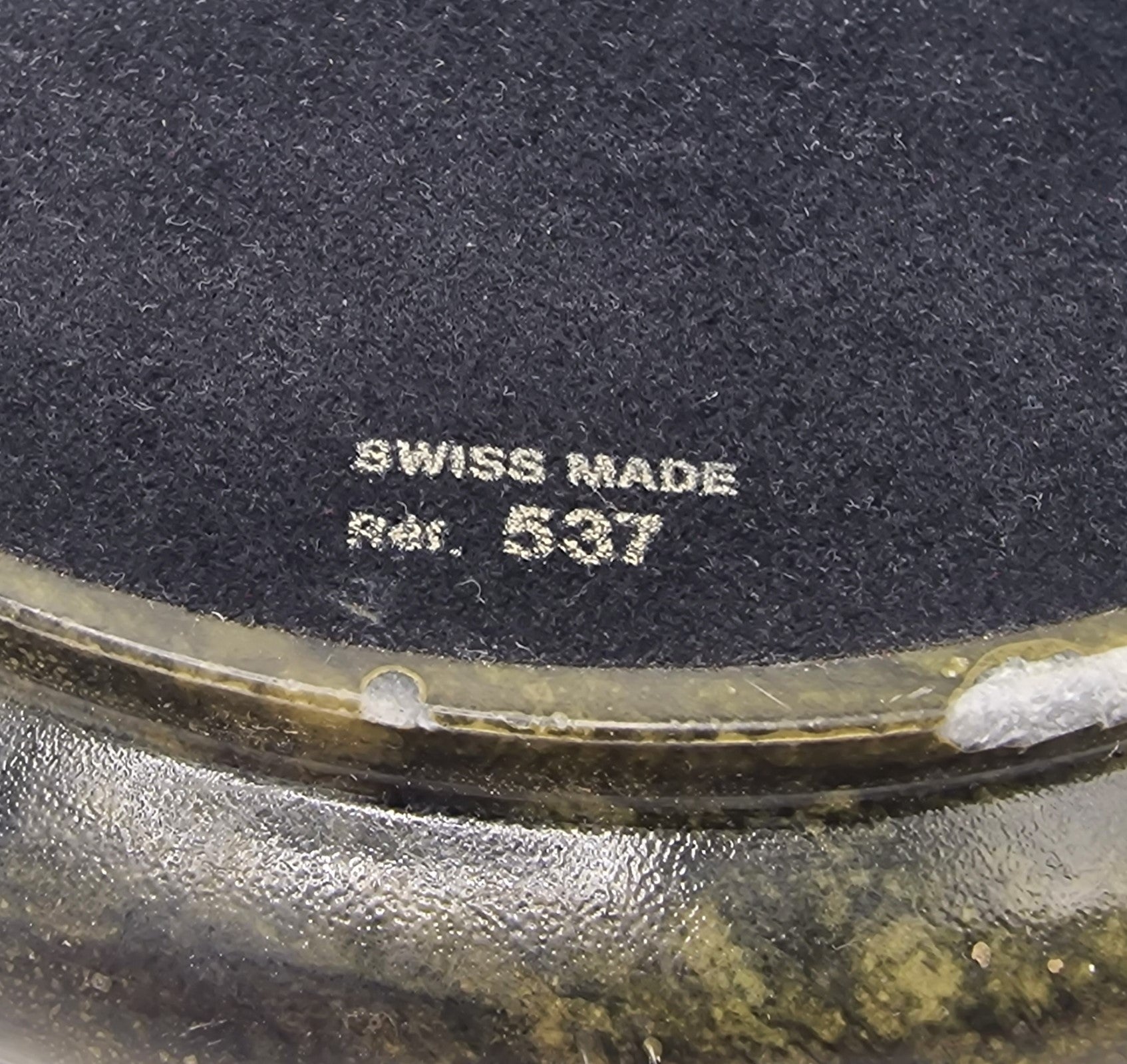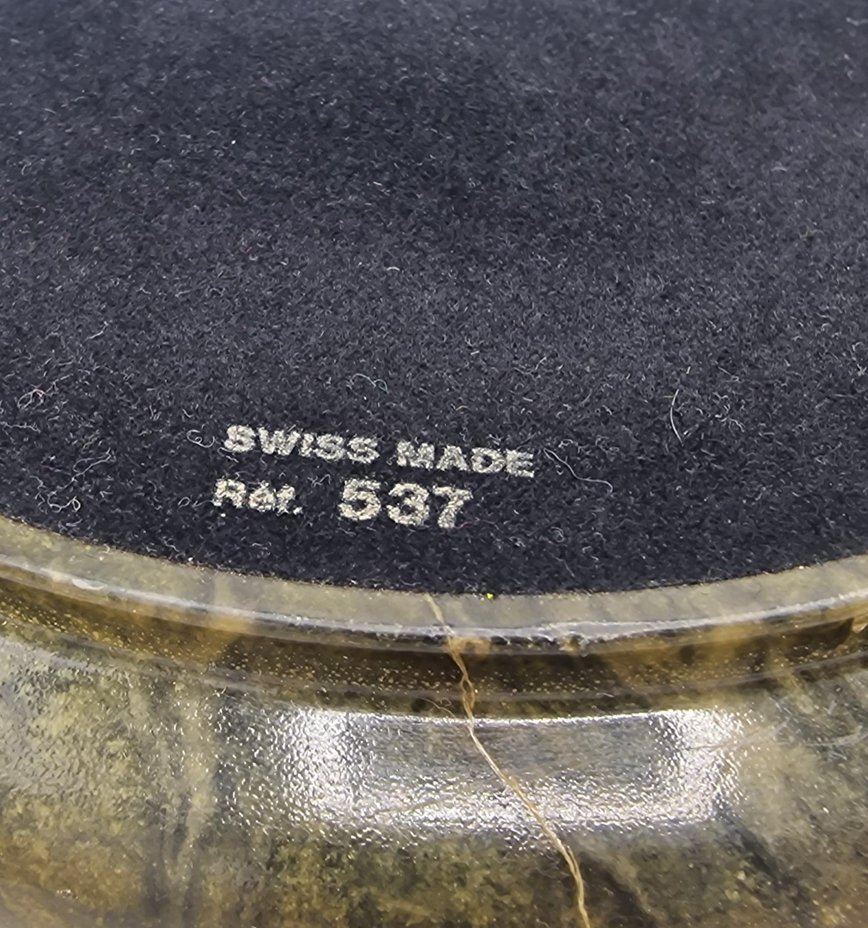 Base en terciopelo negro con la referencia "SWISS MADE REF. 537" propia de este modelo.